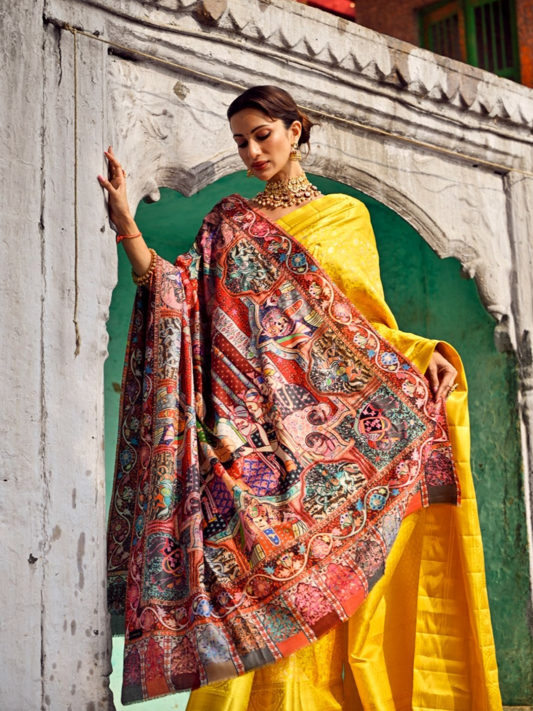 Kaani woven shawls are meticulously crafted on traditional looms using colorful threads to create complex, tapestry-like designs. These luxurious shawls feature intricate floral, geometric, and nature-inspired patterns, showcasing the extraordinary skill and heritage of Kaani weaving from Kashmir.