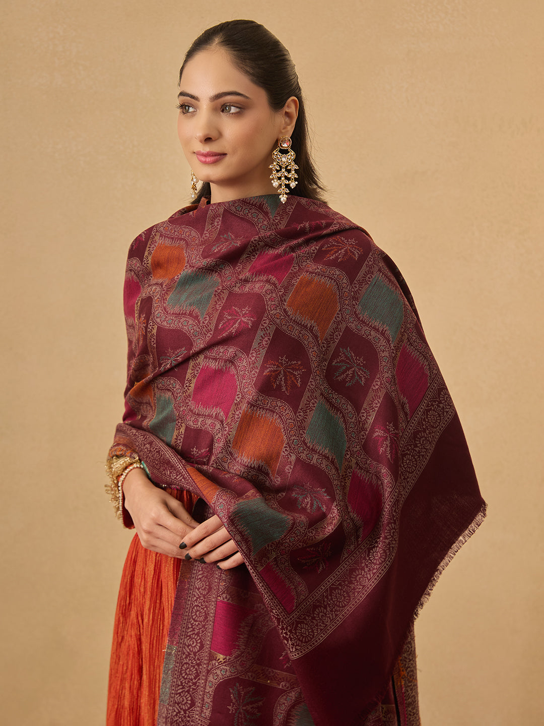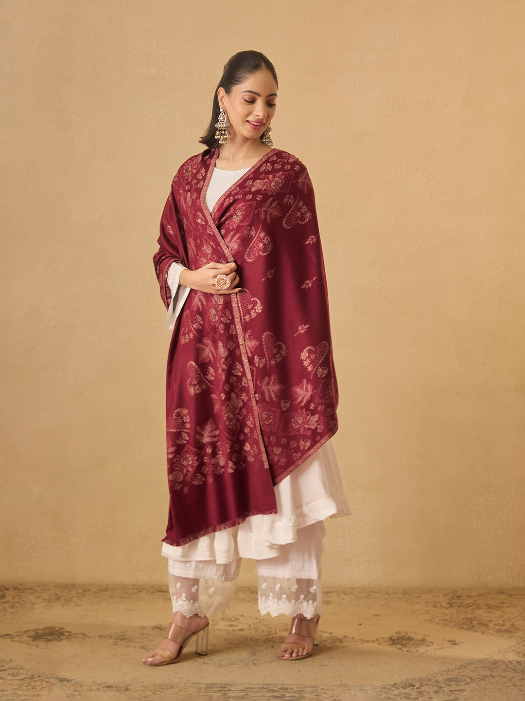 Pashmoda Women Mehroom Zari Kaani Border Fine Wool Shawl (Size 40X80 inches)