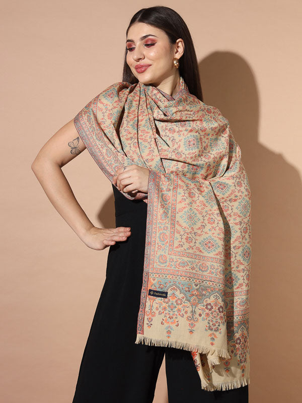 - Gracefully drape the Pashmoda shawl over your shoulders, allowing its intricate patterns to shine. Pair it with formal wear for a touch of opulence, or wrap it loosely with casual attire for a fusion of tradition and modernity. The Kaani shawl's elegance elevates any outfit, making it a versatile fashion statement.
